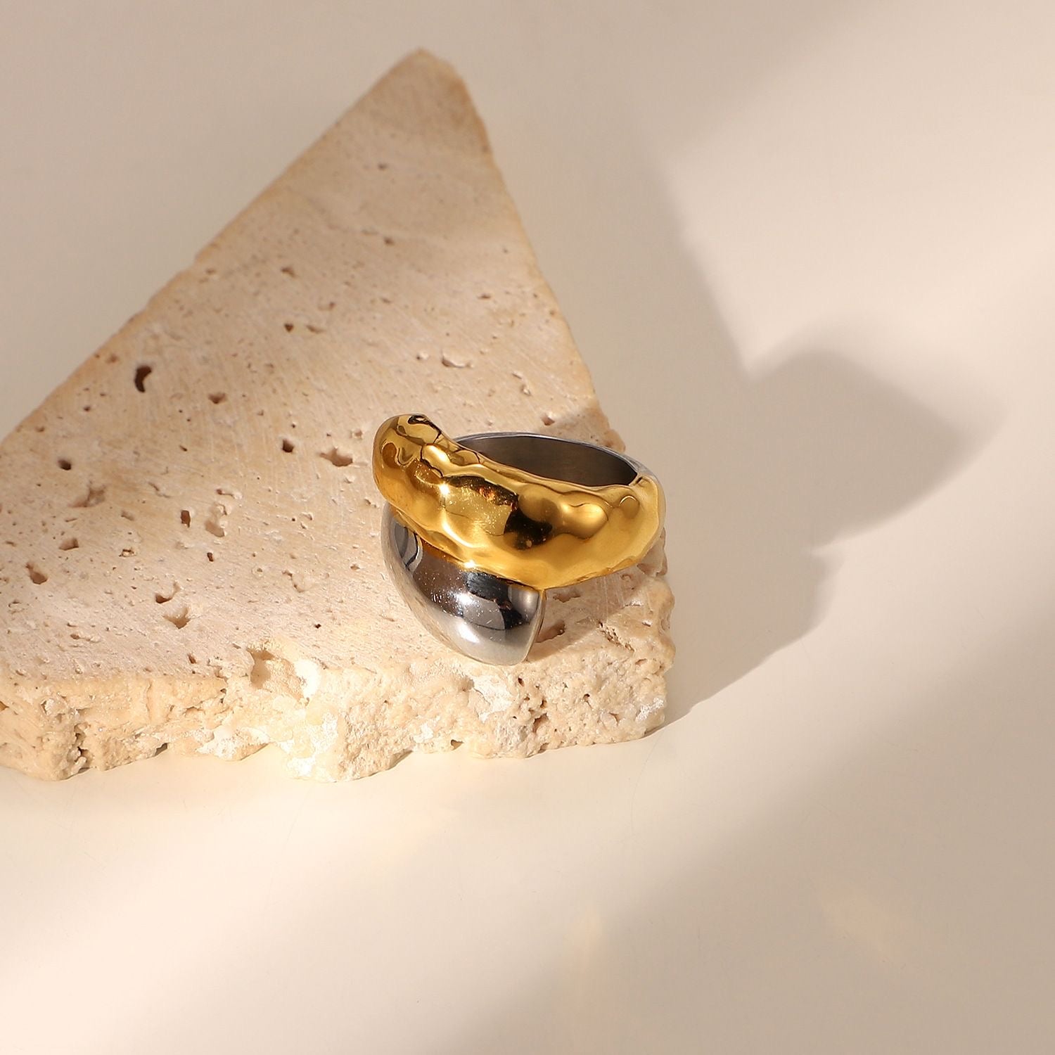 Anillo estilo chunky de dos colores, mitad dorado y mitad plateado. Bicolor.